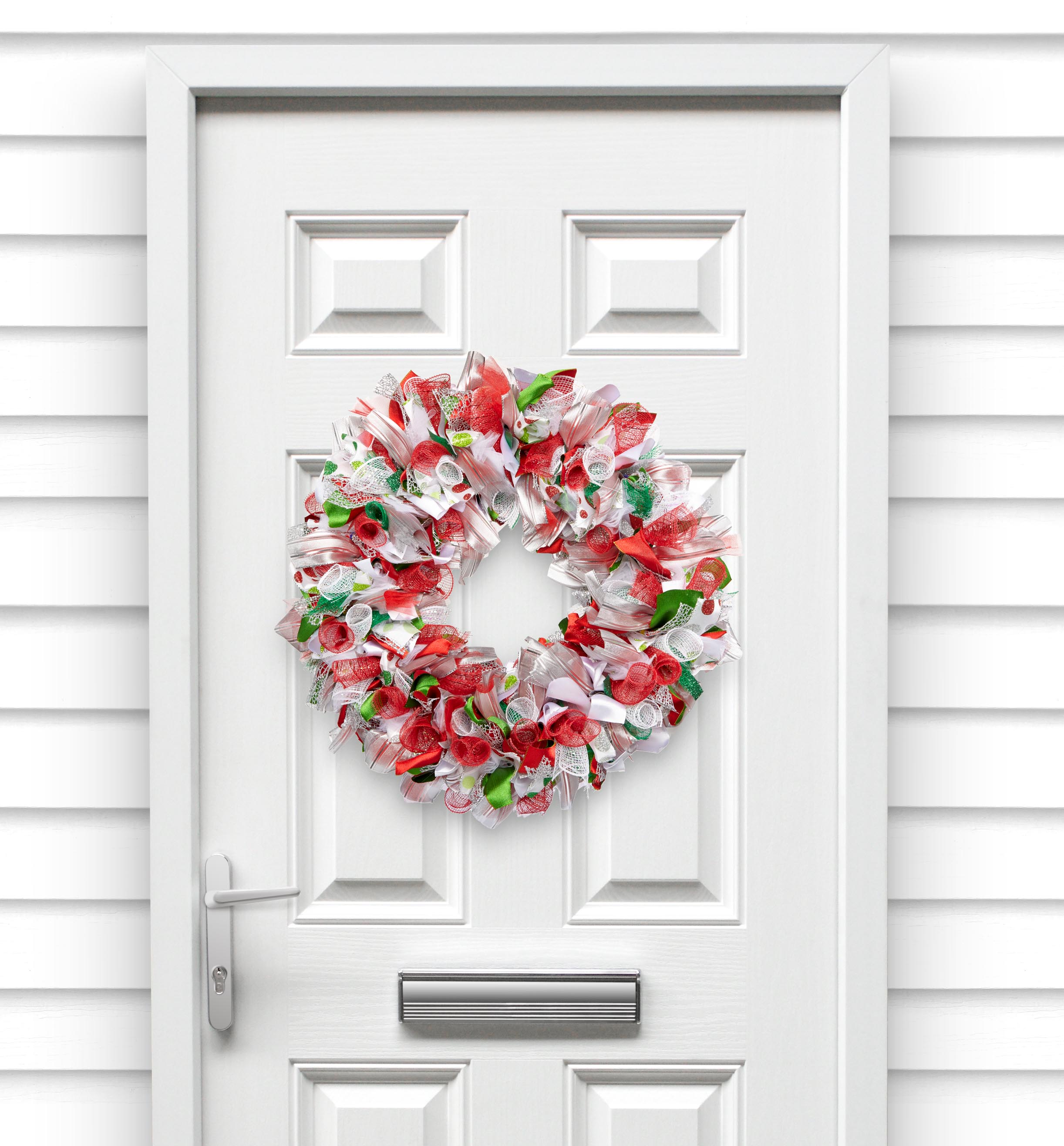 The wreath measures aprox. 18" across. Made with red and white tulle, red and white mesh, with silver and green accent ribbons, on welded wire support.