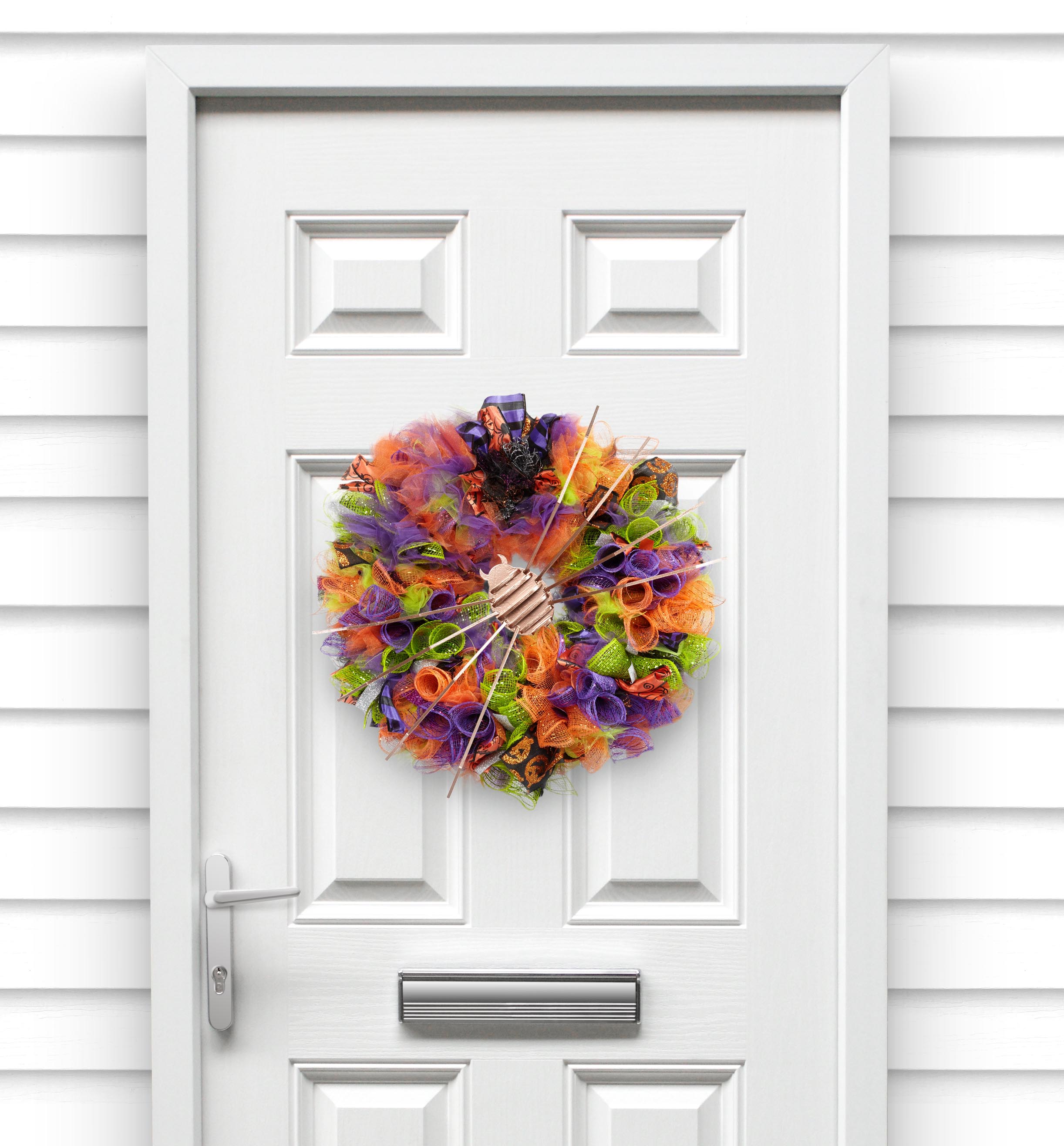 The wreath measures aprox. 16" across and is adorned with birch-wood copper painted spider cutout. Decorated with orange, neon green and purple tulle and ribbons.