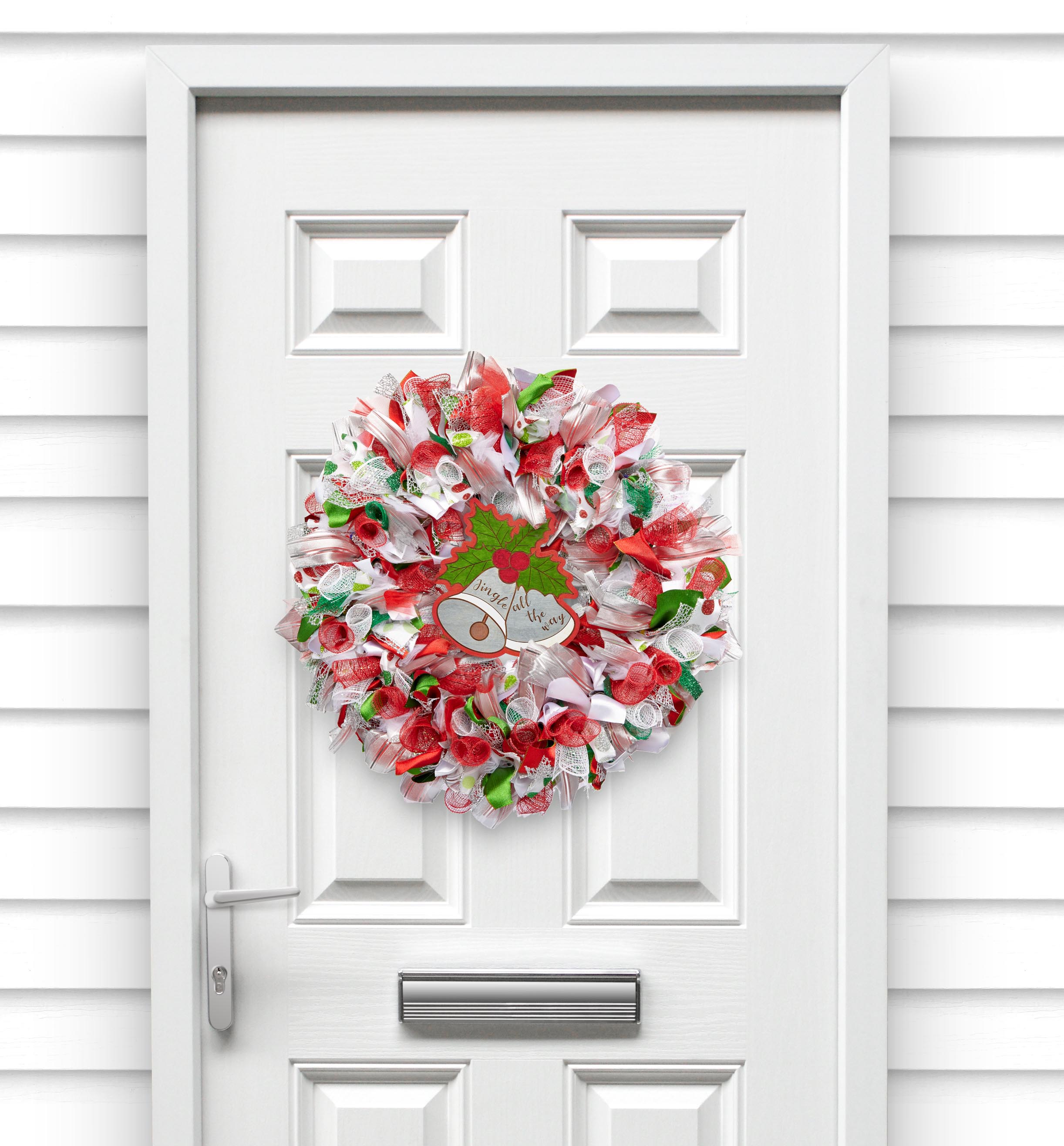 The wreath measures aprox. 18" across. Made with red and white tulle, red and white mesh, with silver and green accent ribbons, and a painted wood adornment, built on a welded wire support.