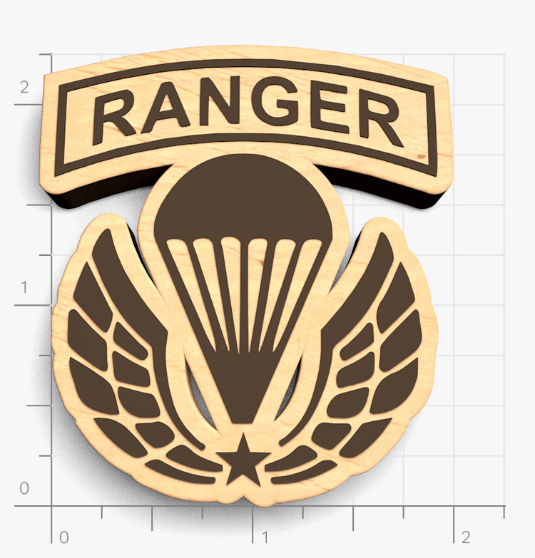 This collectible badge is laser cut from 1/8 or 1/4" finished birch wood. The etching is often painted to add extra contrast to the engraving.
